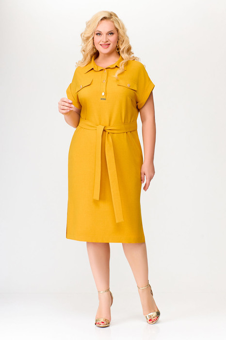 Платье из мягкой вискозно-льняной ткани полуприлегающего силуэта. По переду обработаны нагрудные вытачки и планка до линии груди, застёгивающаяся на 4 петли и 4 декоративные металлические пуговицы. По переду платья расположены два нагрудных клапана с пуговицами. Воротник рубашечный с отрезной стойкой. Рукав цельнокроеный, короткий, спущенный с отложной манжетой по низу. В комплекте пояс из основной ткани.