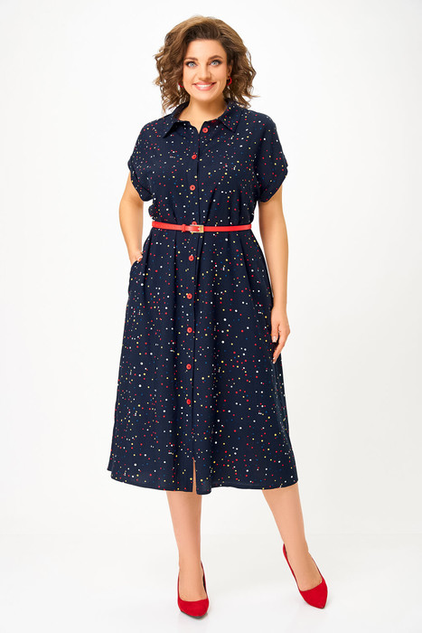 Платье-рубашка из лёгкой вискозной ткани, свободного кроя А-силуэта. Застёжка центральная на петли и декоративные пуговицы. Полочка с нагрудными вытачками, спинка цельная. Воротник рубашечного типа, отложной со стойкой. Пройма спущенная с отложной манжетой. В боковых швах обработаны  карманы.