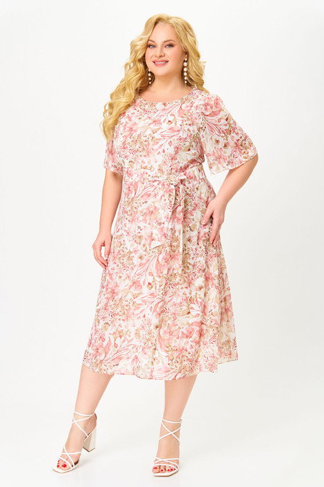 Платье полуприлегающего силуэта из мягкой шифоновой ткани на трикотажной подкладке. Полочка с отрезными рельефами, спинка с центральным швом и рельефами. Горловина округлой формы. Рукав втачной, формы «колокол», по окату с лёгкой сборкой, длиной 34 см.
