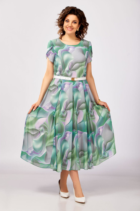 Платье из шифона на трикотажной подкладке, Х-образного силуэта с полуприлегающим лифом. Платье отрезное по линии талии. По переду лифа расположены рельефы, по спинке лифа талиевые выточки. Юбка расклешенная из шести клиньев со встречными складками по линии талии. В среднем шве спинки предусмотрена потайная тесьма- молния. Рукав втачной покроя тюльпан, длина рукава 15 см.