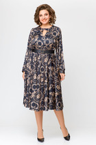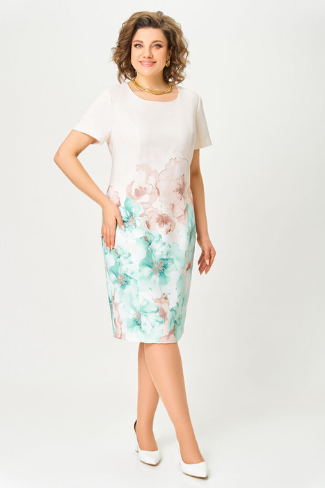 Платье полуприлегающего силуэта из мягкой поливискозной ткани с оригинальным дизайнерским принтом. По полочке выполнены рельефные швы, по спинке рельефные швы, средний шов со шлицей и застёжкой на потайную тесьму-молнию. Горловина круглая, обработана обтачкой. Рукав втачной, короткий.