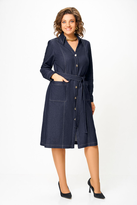 Платье из джинсовой ткани прямого силуэта с центральной застёжкой на петли и джинсовые пуговицы.  Полочки с притачными фигурными планками, с рельефным швом и кокеткой, на уровне бёдер накладной карман с планкой и фирменной нашивкой «Swallow».