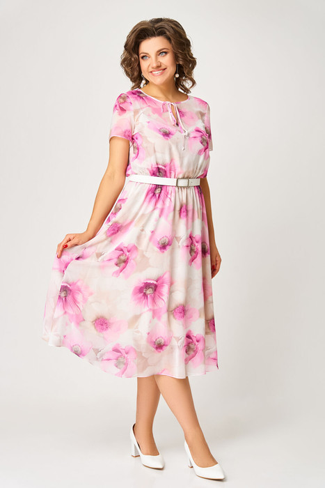 Платье из мягкой шифоновой ткани, на трикотажной подкладке, отрезное по линии талии, шов собран на эластичную тесьму-резинку. Горловина округлой формы, по переду капелька с завязкой. Рукав втачной, короткий.
