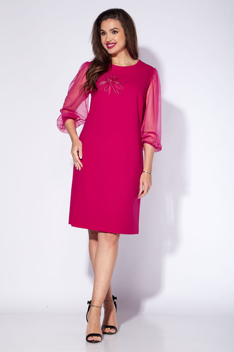 Платье женское, полуприлегающего силуэта с рукавом длиной 7/8. Рукав выполнен из отделочной ткани (сетка), фантазийной формы. По верху рукава сборка. Низ так же присобран на узкую резинку. По переду нагрудные и талевые вытачки. Перед платья, сверху задекорирован вышивкой. Вырез горловины круглой формы. По спинке средний шов и талевые вытачки. Застежка в шве на потайную "молнию". По низу разрез. Длина платья по спинке 48-50 93 см, 52-56 96 см.