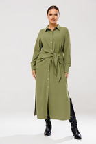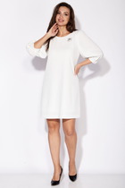 Платье женское, А-образного силуэта. Рукав втачной, длиной 3/4 фантазийной формы. Сверху рукав со сборкой. Снизу притачная манжета и мягкие складки. Вырез горловины круглой формы. Декором служит съемная брошь. Платье на трикотажной подкладке. Спинка без особенностей.