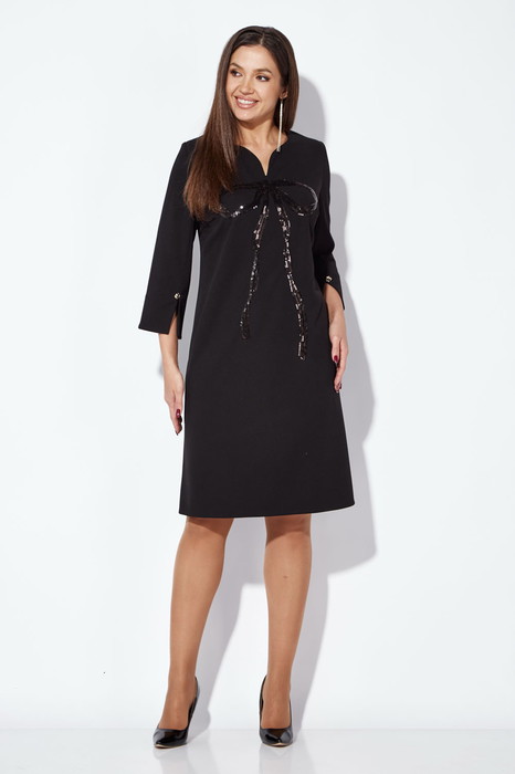Платье женское, А силуэта, с втачным рукавом, длинной 3/4. Рукав расширенный к низу с разрезом по шву. Разрез зафиксирован на навесную петлю и отделочную пуговицу. Вырез горловины фигурной формы. Перед задекорирован вышивкой из паеток. По спинке средний шов и талевые вытачки. Застежка на потайную тесьму "молния" в среднем шве.