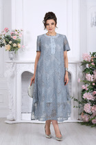 Платье женское, свободного силуэта, расширенное к низу. Рукав короткий, цельнокройный. Горловина круглой формы.По спинке небольшой разрез в средном шве, акцентирован декором "монетка" Разрез выше линии тали, по переду регулируется с фиксаторами. По центру спинки небольшая сборка. Подрез по линии бедер оформлен присобранным воланом.