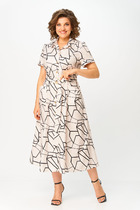 Платье женское, прямого силуэта, зауженное к низу. Рукав цельнокройный, длинной 7/8 с вставкой из принтованной сетки. По низу рукава фигурный волан с отделочной деталью и декором. Вырез горловины круглой формы. Вдоль горловины по переду и спинке декоративные вытачки. По спинке средний шов с разрезом снизу.