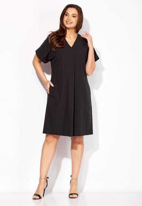 Платье женское, прямого силуэта с коротким цельнокройным рукавом. По низу рукава манжета. Вырез горловины У-образной формы. По центру переда, от горловины мягкая складка. В боковых швах функциональные карманы с отделочной строчкой имитирующей накладной карман. По спинке отрезная кокетка, средний шов и мягкая, встречная складка по центру с отделочной нашивкой.