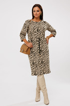 Платье женское, А силуэта, с рукавом длинной 3/4. Рукав втачной, со сборкой по окату, и мягкими складками по низу. По переду нагрудные вытачки. Вырез горловины круглой формы. Карманы накладные, акцентированы стилизированным цветком с декором. По спинке средний шов с отделочной нашивкой сверху.