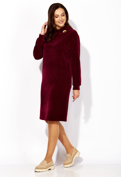 Платье женское, прямого силуэта с длинным рукавом. Рукав со спущенной линией плеча, по низу на манжете. Горловина оформлена высокой, мягкой стойкой. По боку разрез, акцентирован декоративной сточкой. Спинка без особенностей.