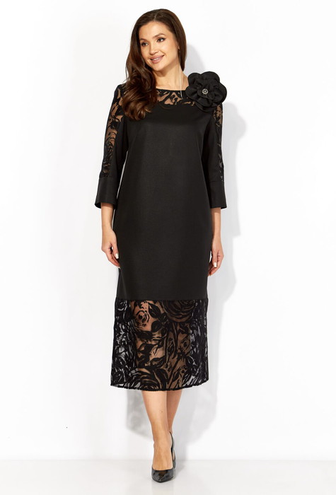 Платье женское, прямого силуэта, с втачным рукавом, длинной 3/4. Платье изготовлено из текстильной ткани с напылением и органзы с рисунком. Кокетки по переду и спинке, верхняя часть рукава и нижняя часть платья из огранзы. По боку разрез с отделочными планками. По низу рукава широкая манжета. Вырез горловины круглой формы. Застежка сзади на навесную петлю и пуговицу. Декором служит большой, съемный цветок из атласной ткани.