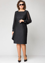 Платье женское трикотажное прямого силуэта зауженное к низу. По полочке нагрудные вытачки из боковых швов, спинка со средним швом и талевыми вытачками. Платье со спущенной проймой, по краю проймы отделочная тесьма с бахромой из мелких металлических бусинок. Вырез платья спереди лодочкой, по спинке треугольной формы с двумя узкими бретелями крест-накрест. Длина платья по спинке 103 см.