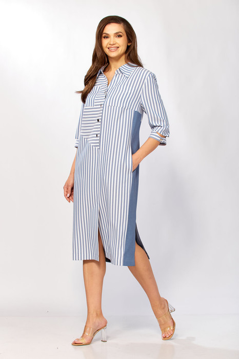 Стильное платье прямого силуэта, комбинированное из двух видов ткани. Продуманные линии кроя выгодно обрамляют фигуру, а сочетание однотона и полоски добавляет образу графичности и стиля.