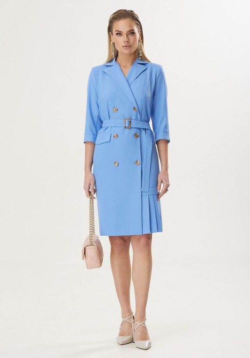 Платье женское полуприлегающего силуэта, выполненное из поливискозы плательной группы. Платье с двухбортной застежкой на петли-пуговицы. Горловина оформлена воротником пиджачного типа. Рукава двушовные, длиной 3/4, по низу обработаны притачной манжетой. По спинке - средний шов и талиевые выточки. По переду расположены нагрудные выточки. В левой боковой части переда вставлена отделочная деталь со складками, направленными к центру, над которой горизонтально расположена пата. В комплект к платью входит пояс из основной ткани с декоративной пряжкой, в цвет фурнитуры.