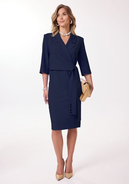 Платье полуприлегающего силуэта, выполненное из плательно-костюмной ткани, длиной миди. Одна из деталей лифа - отлетная, имитирующая образ комплекта "жакет и платье". Перед платья с нагрудными вытачками. Верхняя, жакетная часть платья завязывается на фигурный пояс, декорированный пуговицами. Спинка со средним швом и талиевыми вытачками. В нижней части среднего шва спинки обработана шлица. В левом боковом шве расположена потайная молния. Рукав втачной, двухшовный. Горловина платья оформлена воротником жакетного типа.