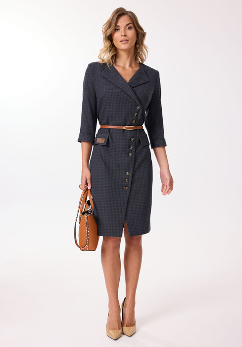 Элегантное платье полуприлегающего силуэта с асимметричной застежкой на петли и пуговицы. Перед платья с нагрудными вытачками и клапанами в области бёдер. На одном клапане, в качестве декора, — нашивка. Спинка с талиевыми вытачками и средним швом, внизу которого обработана шлица. Застежка асимметричная, двубортная, по низу платья расходится на разрез. В области плеч — погоны, закрепляющиеся на пуговицу. Рукава двухшовные втачные, длиной 3/4, с притачной манжетой. Платье с плечевыми накладками и со съёмным ремнем в цвет фурнитуры. Фурнитура (пуговицы и ремень) могут незначительно отличаться от представленных на фото.