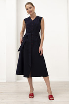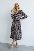 Платье полуприлегающего силуэта, длиной миди, выполненное из поливискозного трикотажного полотна. Перед с нагрудными вытачками и фигурным v-образным вырезом горловины. Горловина декорирована горизонтальным элементом из основной ткани и декоративной съёмной цепью. Спинка со средним швом, в котором обработана потайная молния. Рукав втачной одношовный длиной 3/4.