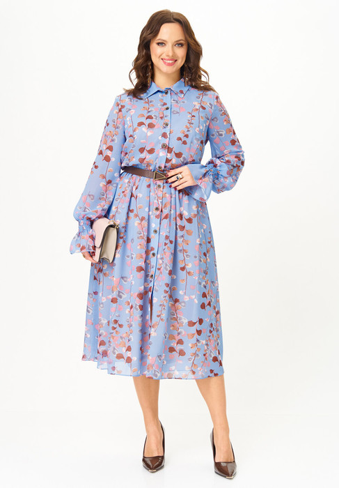 Платье полуприлегающего силуэт длиной "мидакси", выполненое из итальянского шифона. Платье отрезное по линии талии, на резинке, что делает силуэт изысканным. Перед с нагрудными вытачками и центральной застёжкой на петли и пуговицы на притачной планке. Горловина обработана воротником рубашечного типа. Спинка лифа цельнокроеная. Рукав втачной, длинный, с широким рядом венгерок, которые добавляют легкий обьем по низу рукава. В нижней части боковых швов обработаны шлицы, которые застегиваются на петли и пуговицы. В комплект входит декоративный пояс.