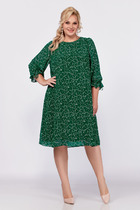Платье А-силуэта длиной "мидакси", выполненое из струящейся плательной ткани, отрезное по линии талии. Перед с нагрудными вытачками и двухбортной застёжкой на петли и пуговицы. Горловина обработана воротником жакетного типа. Спинка лифа с кокеткой и встречной центральной складкой. Нижняя часть платья спинки цельнокроеная. По переду и спинке в области талии обработаны шлевки для пояса с пряжкой, который входит в комплект платья. Рукав втачной, короткий, формы "тюльпан", который удлиняется до линии локтя в зависимости от размера. В боковых швах платья обработаны карманы.