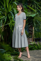 Серое платье из футера с лайкрой. Рукава ниже локтей, общая длина чуть выше середины бедра. Принт в виде розовой туфли, красная окантовка воротника и рукавов. Размеры от 44 до 56. Имеется возможность заказа товара в розницу.