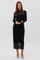 Платье женское с декоративной симметричной вышивкой по полочкам, длиной за колено, трапециевидного свободного силуэта, отрезное по линии талии, со спущенными цельнокроеными рукавами.