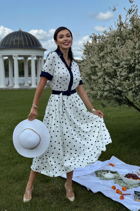 Элегантное белое платье в синий горошек — идеальный выбор для летнего гардероба. Изготовленное из 100% вискозы, оно дарит телу ощущение лёгкости и прохлады даже в жаркие дни. Платье женское, полуприлегающего силуэта, отрезное по линии талии, расширенное к низу, выполнено из плательной принтованной ткани, со съёмным поясом, предназначено для повседневной носки. Нижняя часть платья на подкладке.