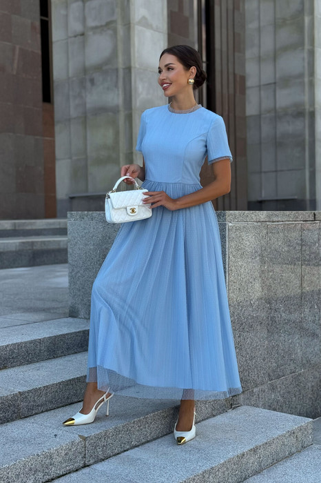 Голубое фатиновое платье женское URS - это тот самый наряд, который сразу создает ощущение праздника, легкости и продуманного стиля. Модель выглядит элегантно и женственно, подходит для торжественных событий, выпускного вечера, свадьбы или особого семейного праздника, когда хочется выглядеть безупречно и уверенно. Платье женское ЮРС, полуприлегающего силуэта, отрезное по линии талии, двухслойное, выполнено из плательной ткани в сочетании с сеткой. Верхний слой из отделочной ткани - сетка, нижний слой из плательной ткани. Лиф платья переда и спинки с рельефными швами, идущими из пройм вниз до шва талии. Верхняя часть спинки со средним швом от горловины до низа платья. От горловины вниз в среднем шве расположена застежка на потайную тесьму - ""молнию"". Юбка из сетки по срезу талии собрана на сборку. Горловина круглой формы обтачная. с притачной узкой деталью из сетки.