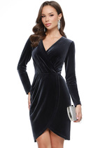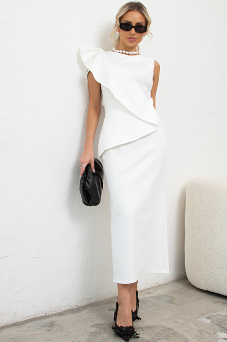 Праздничное платье прилегающего силуэта из плотного трикотажного полотна. Округлая горловина на внутренней обтачке. По спинке застежка на потайную молнию. Перед юбки оформлен баской, переходящей по диагонали в волан, через плечо на спинку. Низ ровный, сзади разрез.