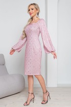 Элегантное платье прилегающего силуэта из трикотажного полотна с добавлением люрекса. Округлая горловина по переду, переходящая в V-образный вырез по спинке, на внутренней обтачке. Низ ровный, по переднему рельефу разрез.
