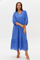 Платье молодежное, свободного покроя, с V- образным вырезом горловины, без рукавов. Горловина и проймы окантованы основным материалом, низ изделия с притачной оборкой. Акцентной деталью платья являются узкие завязки, вставленные в горловину с изнаночной стороны, завязывающиеся на бант спереди, которые при желании изменить внешний вид изделия, могут быть убраны вовнутрь.