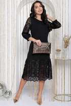 Платье-туника из ажурного трикотажного полотна с капюшоном. Длина миди. Вырез горловины V-образной формы. Рукав узкий, длинный. По низу рукава отверстие для большого пальца. В боковых швах высокие разрезы от талии. Талия фиксируется длинными завязывающимися поясками. Длина 119 см. Длина рукава 67 см.