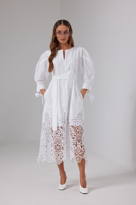 Платье из хлопковой ткани «ришелье». Длина миди. Горловина круглой формы. Застежка по переду на потайную молнию. В боковых швах карманы. Рукав объемной формы с завязывающейся манжетой по низу.  По талии платья складки и широкие шлевки. Талия фиксируется съемным завязывающимся поясом. Платье на подкладке.