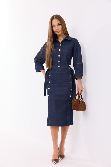 Платье женское выполнено из джинсовой ткани, покроя спущенное плечо. По спинке кокетка и средний шов. Горловина оформлена стояче-отложным воротником. В верхней части переда расположена центально-бортовая застежка-планка на петли-пуговицы. В области талии расположен пояс завязывающийся на металлические полукольца. Нижняя часть платья оформлена планками, застегивающимися на петли-пуговицы.