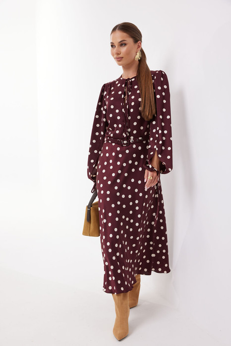 Лиф с переходящим плечевым швом на перед, нагрудными вытачками, по спинке - с талиевыми вытачками, по плечевым швам небольшая сборка, по переду средний шов, горловина окантована бейкой, переходящей в завязки. Длина платья ниже колена.