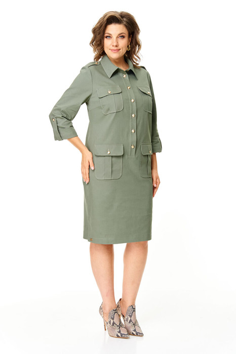 Платье прямого силуэта с естественной линией плеча. Спинка со средним швом и кокеткой. Перед с нагрудными вытачками, накладными карманами и клапанами. По переду обработана отделочная отрезная планка с застежкой на петли-пуговицы. Рукав втачной одношовный длиной 3/4 с отделочной манжетой и патой по низу. На плечевых швах имеются отделочные паты с пуговицами. В боковых швах выполнены невысокие разрезы. На правой стороне переда, по низу, пришита декоративная нашивка. Отделочные строчки контрастного цвета. Вся фурнитура металлическая premium качества.