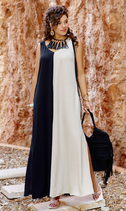 Летнее платье длины миди, выполненный в сочетании черного и бежевого цветов, предстает перед воображением как символ изящества и легкости, а сочетание черного и бежевого цветов всегда выглядит стильно и актуально.