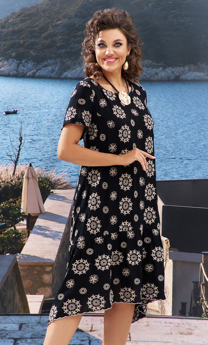 Платье восхитительно смотрится на фигуре, подчеркивая ваши формы и скрывая недостатки, а интересный принт добавляет романтичности вашему образу. Платье трапециевидного силуэта с округлой горловиной, по переду нагрудные вытачки; низ с ассиметричным подрезом и воланом со сборкой от подреза. По низу волана фестоны. Спинка с V-образной горловиной и декоративной лентой из отделочной ткани, завязывающейся на бант. Рукав втачной, одношовный. Длина платья от высшей точки плечевого шва до низа 109 см(р.50-54), 111 см (р.56-60). Длина рукава 21 см.