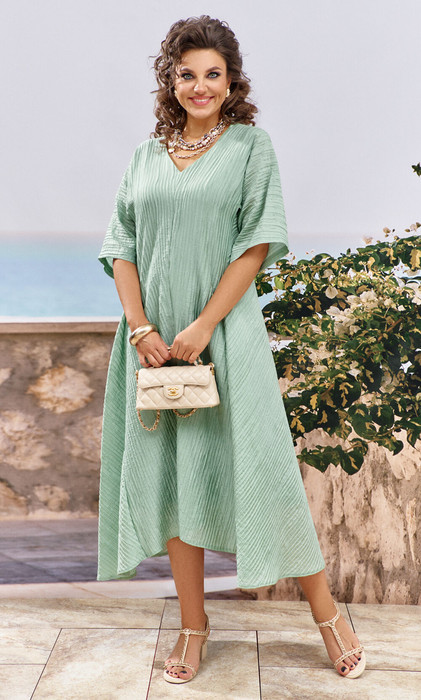 Лиоцелл - инновационное волокно на основе эвкалиптовой целлюлозы. По внешнему виду и свойствам полотно очень походит на натуральный шелк - гигроскопично и воздухопроницаемо. Приятный матовый блеск на лицевой стороне ткани обеспечивает роскошный внешний вид. Минималистичный крой платья, помноженный на пластические свойства ткани «гофре» подчеркнет все, что нужно подчеркнуть, и скроет все, что нужно скрыть. Платье длинное, трапециевидного силуэта со с цельнокроенным рукавом длиной до локтя, и V-образной горловиной. По переду – средний шов и глубокие складки по линии бочков. Платье на подкладке.