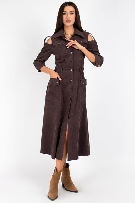 Перед с нагрудной вытачкой и накладными карманами с застежкой на петлю и пуговицу.