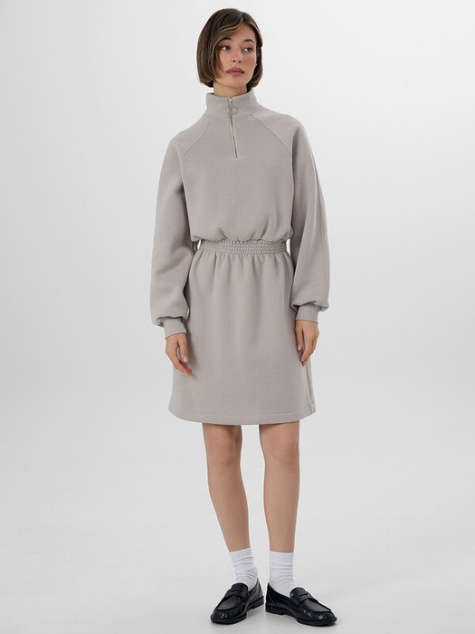 Стильное женское платье длины мини из нежного и приятного к телу трикотажного футера. Силуэт свободный, вырез круглый, с воротником-стойкой. Рукава длинные и объемные, на манжетах. По шее проходит вертикальная застежка-молния. Эластичная тесьма в поясе с декоративными строчками акцентирует внимание на талии.