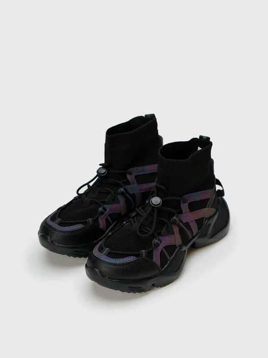 Высокие кроссовки-socks (сокс) для девочки подростка. Верх - вязаный стрейчевый носок + элементы из светоотражающего материала. Носочная и пяточная часть имеет дополнительное усиление. Модель имеет дополнительную фиксацию на стопе с помощью эластичного шнурка с утяжкой. Профилированная стелька из свиной кожи с анатомической формой подсводника обеспечивает правильную нагрузку на стопу. Подошва из ЭВА легкая и гибкая. Колодка очень удобная. Наличие светоотражающих элементов.