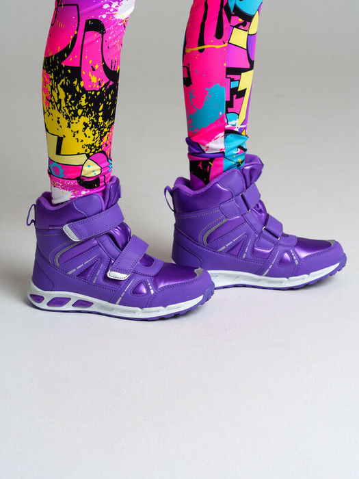 Конструкция верха изготовлена с использованием мембранных технологий. Усиленная защита носка и пятки специальными материалами. Подкладка и стелька выполнены из шерстяного меха 80%. Трехслойная стелька с фольгой, которая обеспечивает сохранение тепла в течение длительного времени. Формоустойчивый задник поддерживает стопу в правильном положении. Подошва имеет противоскользящий протектор. Удобная застежка-липучка. Модель со светодиодной подсветкой позволяет хорошо видеть ребенка даже в темное время суток. Рекомендованный температурный режим от 0°С до -20°С.