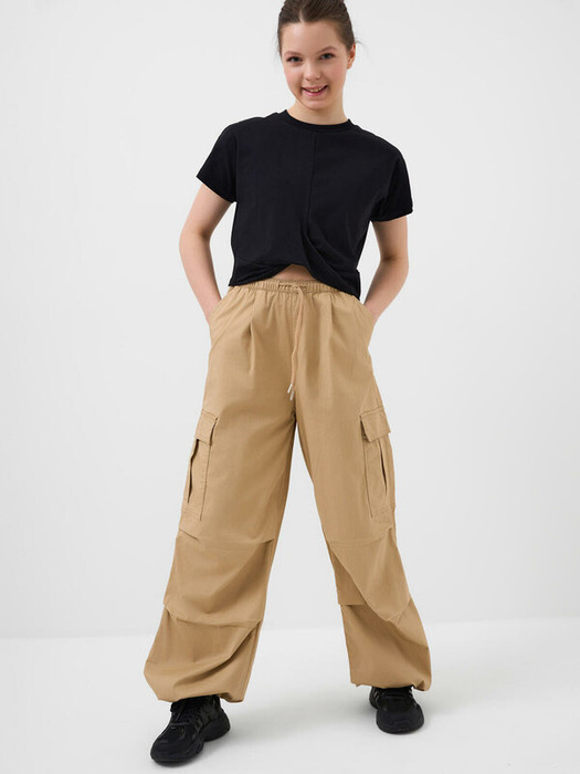 Брюки карго для девочки подростка. Выполнены из плотного хлопкового твилла. Модель имеет заниженную посадку и свободный крой с утяжками внизу, которые позволяют регулировать ширину брючин. Пояс на резинке с дополнительной регулировкой шнуром. На бедрах расположены накладные карманы на липучке, а также боковые карманы.