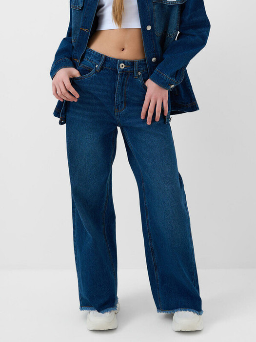 Джинсы широкие для девочки подростка. Застежка на молнию и болт. На талии — пояс с регулировкой внутри. Модель wide leg свободного прямого кроя, с высокой посадкой и необработанным низом. Джинсы имеют пять карманов. Сзади — декоративная этикетка. Низ брюк — с легкой бахромой.