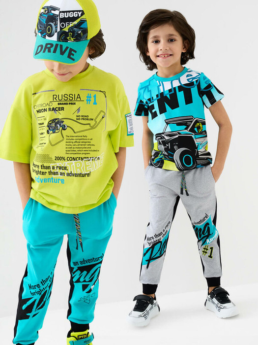 Комплект детских брюк-джоггеров для мальчика. Набор из двух джоггеров выполнен из хлопкового трикотажа джерси. Модель прямого кроя со средней посадкой на талии. Пояс выполнен на резинке, дополнительно регулируется шнурком. По бокам — удобные карманы. В нижней части брючин предусмотрены эластичные трикотажные манжеты для лучшей фиксации. Украшены принтами.