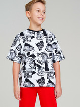 Детская футболка для девочки. Модель свободного кроя, выполнена из эластичного хлопкового трикотажа джерси. На груди расположен крупный принт с любимым персонажем Хэллоу Китти. По низу эластичная резинка.