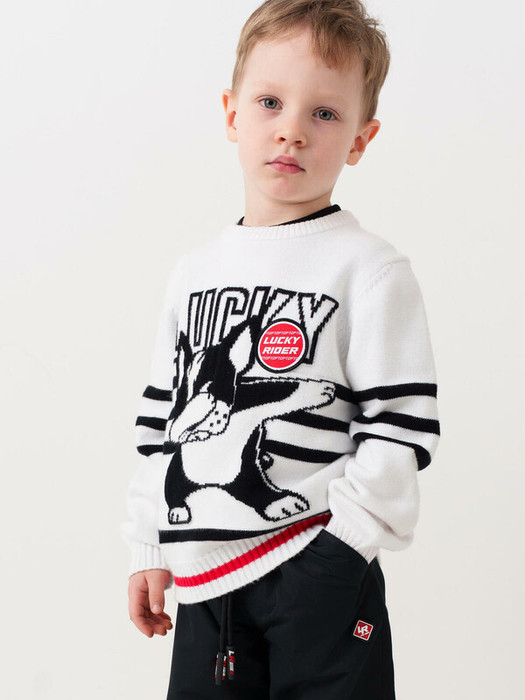 Детский вязаный джемпер для мальчика. На передней части изображён весёлый принт с собакой и крупной надписью. Низ и манжеты из эластичного риба.
