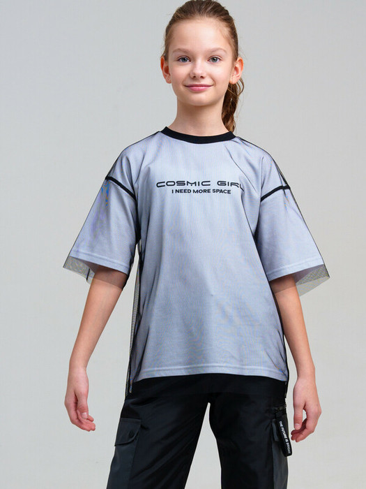 Футболка для девочки подростка.  Футболка оверсайз из качественного и приятного на ощупь трикотажа джерси с высоким содержанием хлопка 95%. Благодаря наличию эластана в составе ткани изделие проще в уходе и держит форму. Декор из сетки. Модель выполнена из качественного и приятного на ощупь трикотажа.