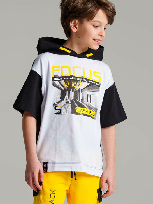 Футболка из качественного и приятного на ощупь трикотажа джерси. Силуэт oversize. С капюшоном. Высокое содержание хлопка 95%. Благодаря наличию эластана в составе ткани, изделие проще в уходе и держит форму. Принт сохраняет первоначальный вид даже после многочисленных стирок.